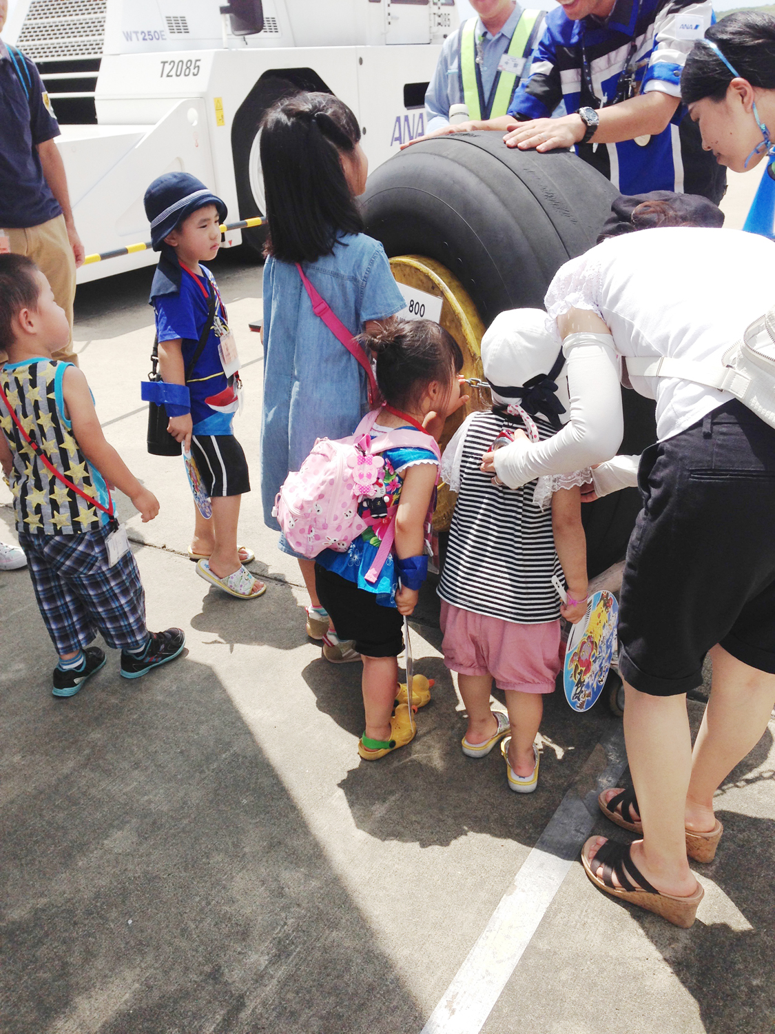 本物の飛行機の離着陸にあわせてエプロンに出ると、エンジンの匂い? 飛行機のタイヤのゴムの匂い? と、いろんな匂いをかぐことが出来ました。同時に、「飛行機のために働く車」を見学したり、離陸する飛行機に手を振ったり、なかなか出来ない体験も。