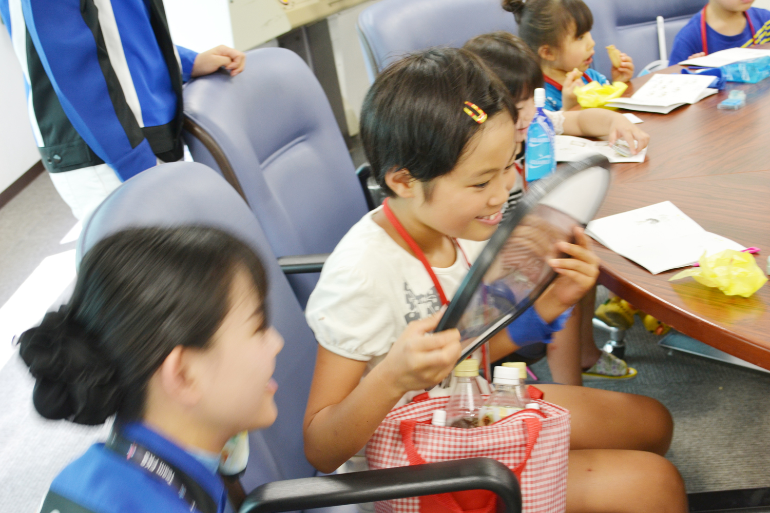 エプロンでの見学を終えると、会議室でこれまで集めた匂いをパスポートにまとめます。また、整備士さんが飛行機の部品(窓ガラスやボタンスイッチなど)を持ってきてくださったので、その匂いも嗅いだり、お話を伺ったり……福島名菓「ママドール」を食べながら、みんな入念にスタンプを押していました。